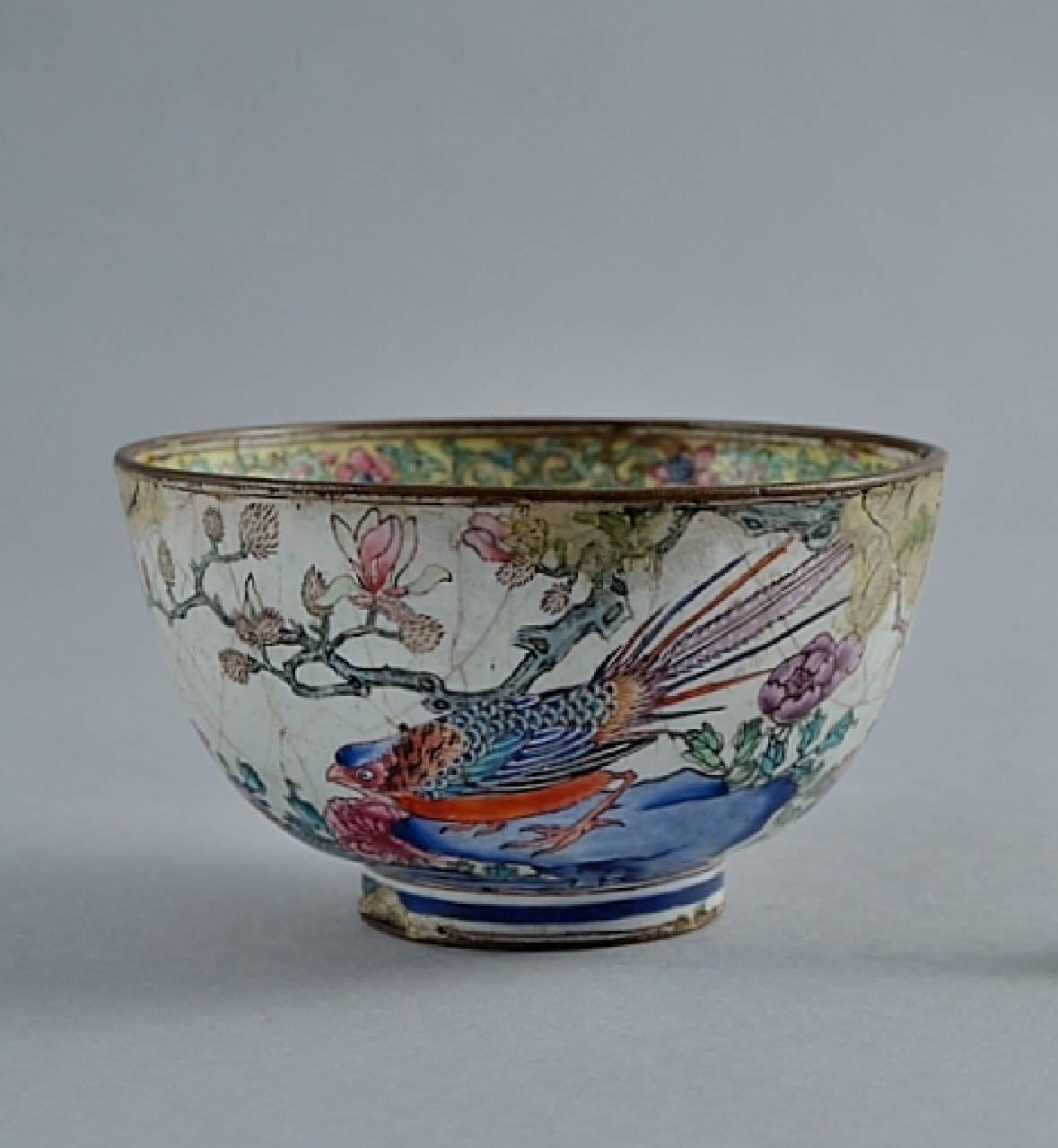 Coppetta in rame smaltato con decorazione raffigurante fenice su roccia ornamental sotto rami di magnolia in fiore. La parete interna è decorata lungo il bordo amotivo di tralci floreali.