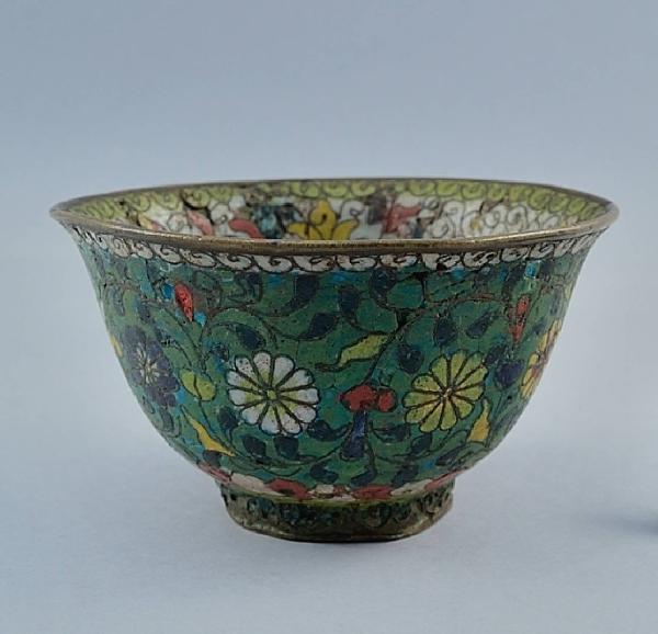 Coppetta con piccolo piede circolare realizzata a smalti cloisonné visibili su entrambe le facce, con decorazione floreale nei colori verde, blu, bianco, giallo, e rosso.