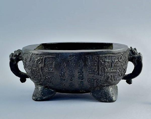 Incensiere in bronzo con quattro piedini triangolari, pancia a forma di vasca con pianta ovale, due anse circolari a protome di drago e bocca con bordo piatto, che forma internamente un rettangolo. Tutta la superficie è decorata a bassorilievo con motivi arcaicizzanti zoomorfi campiti da greche, losanghe e meandri.