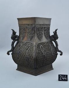 Vaso in bronzo a pianta romboidale con ventre basso leggermente espanso su base bassa a pareti verticali, bocca leggermente espansa e due anse opposte a forma di drago lungo i vertici. La decorazione su ogni faccia è composta di una coppia di lancette a cicala arcaicistica stilizzata sul collo, una coppia di draghi filiformi su fondo di rombi sul ventre e greche sul piede.