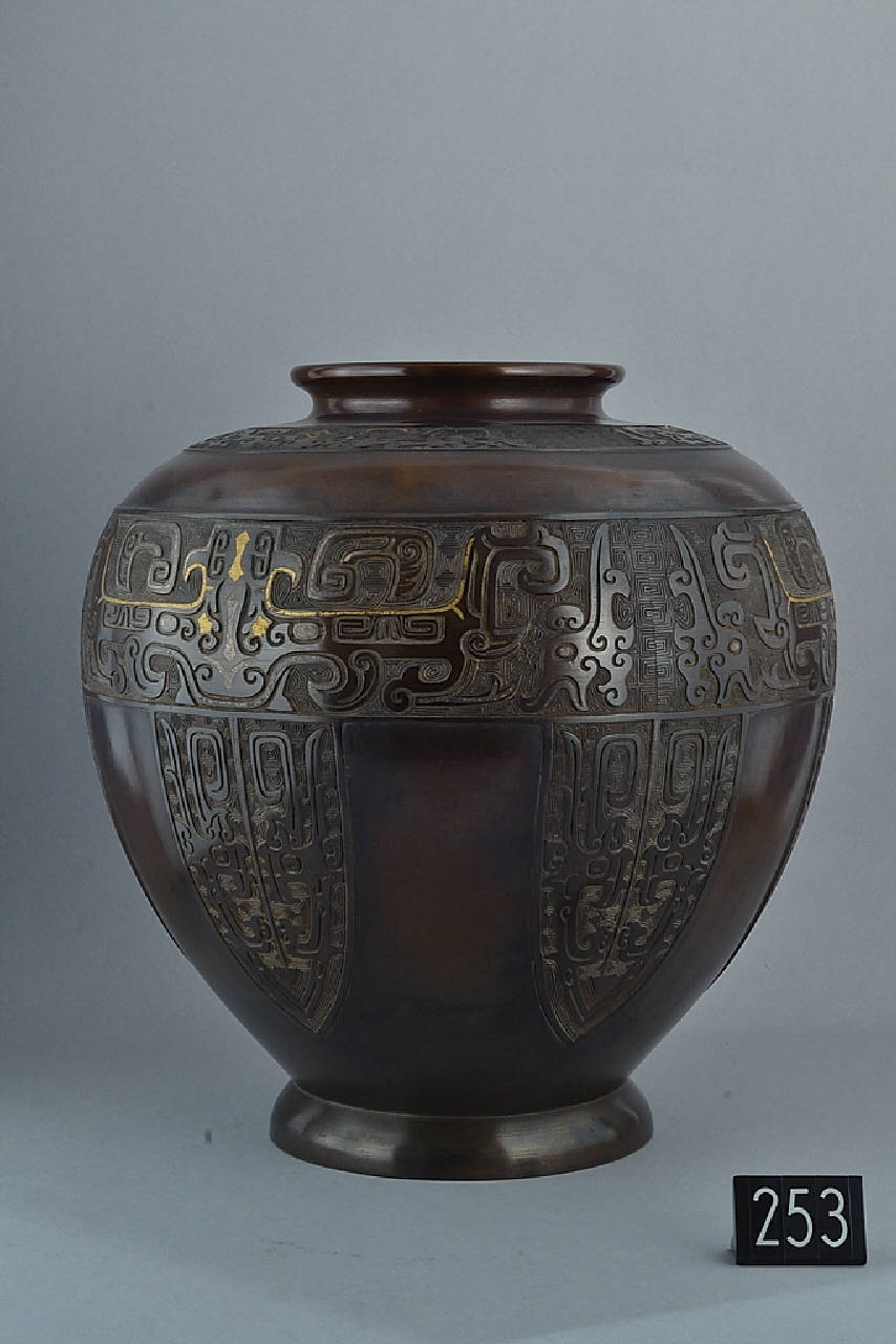 Grande vaso da fiori (tsubo) in bronzo con piede circolare, pancia a spalla alta, stondata, collo circolare brevissimo terminate a bordo everso. La decorazione riprende stilemi arcaicistici cinesi su fondo di greche (leiwen) ed è costituita da una stretta fascia sulla spalla con motivi zoomorfi stilizzati, una fascia più ampia sulla spalla campita da motivi zoomorfi a formare mascheroni (taotie) e sotto di questa motivi stilizzati di cicala arcaicistica. Bronzo patinato colore marrone scuro.