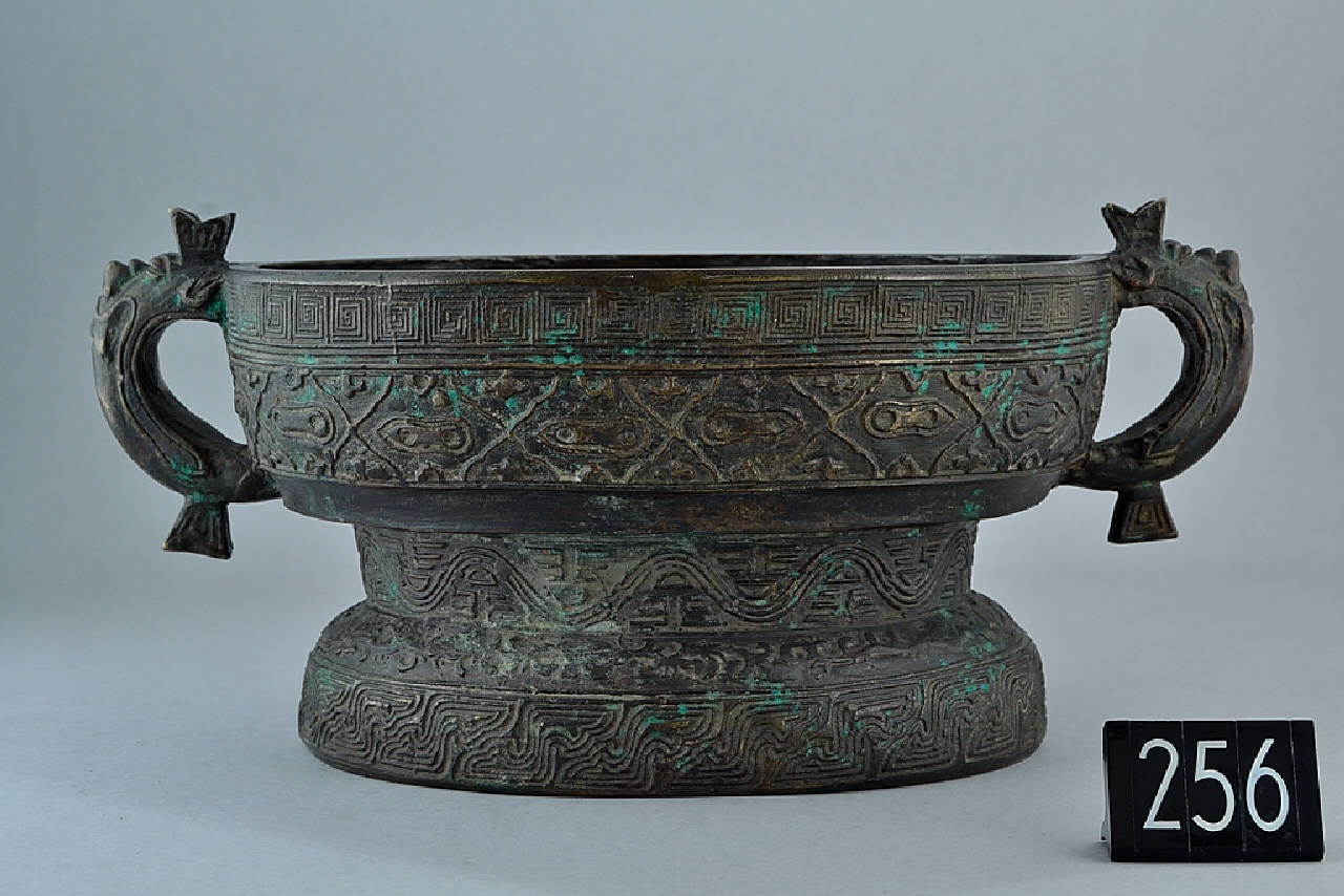 Incensiere in bronzo a coppa, a pianta ovale con pareti stondate che si rastremano al piede, formato da un breve stelo a parete verticale e una base stondata, più ampia. Alle estremità più strette, si trovano due anse a protome di drago che inghiotte un volatile, in uno stile che riprende quello tipico delle produzioni dei bronzi rituali arcaici. La decorazione è realizzata a bassorilievo ed è ripartita per fasce: sull'orlo si trovano meandri, sul ventre e sul piede fasce sovrapposte di serpentina, tralci floreali e onde. All'interno, sul fondo, si trova una lunga iscrizione. Patina artificiale verdina distribuita in modo irregolare.
