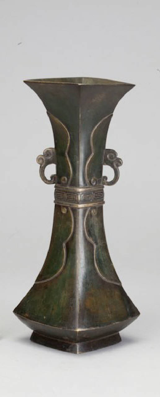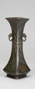 Vasetto in bronzo a painta romboidale dal profilo concavo espanso in basso e in corrispondenza della bocca, leggermente strombata. Due anse a occhiello con profilo lobato che allude a proptomi zoomofe si attacacno ai vertici, a tre quarti dell'altezza, appena sopra una fascia decorativa a rilievo di greche (raimon). Basso piede squadrato, leggermente espanso.