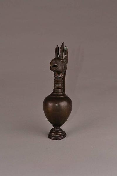 Pastiche costituito da una piccola anfora con collo a torciglione alla quale è stata saldata una testa d'animale con due orecchie dritte e un corno centrale più alto e un'ansa posteriore dal profilo dritto. Bronzo chiaro.