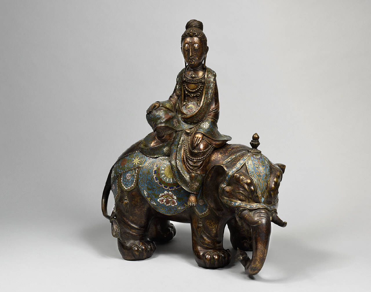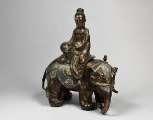 Statua in bronzo dorato ornato a smalti champlevé (blu, bianco, verde, rosso, giallo, rosa), raffigurante il Bodhisattva Fugen (Samantabadhra) in vesti femminili, seduto sull'elefante, l'animale che lo accompagna e caratterizza.