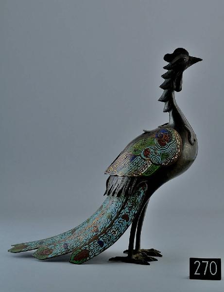 Incensiere in bronzo e smalti champlevé (verde, rosso, blu, azzurro, bianco) a forma di fenice. Le ali sul dorso di possono sollevare per accedere al fornello.