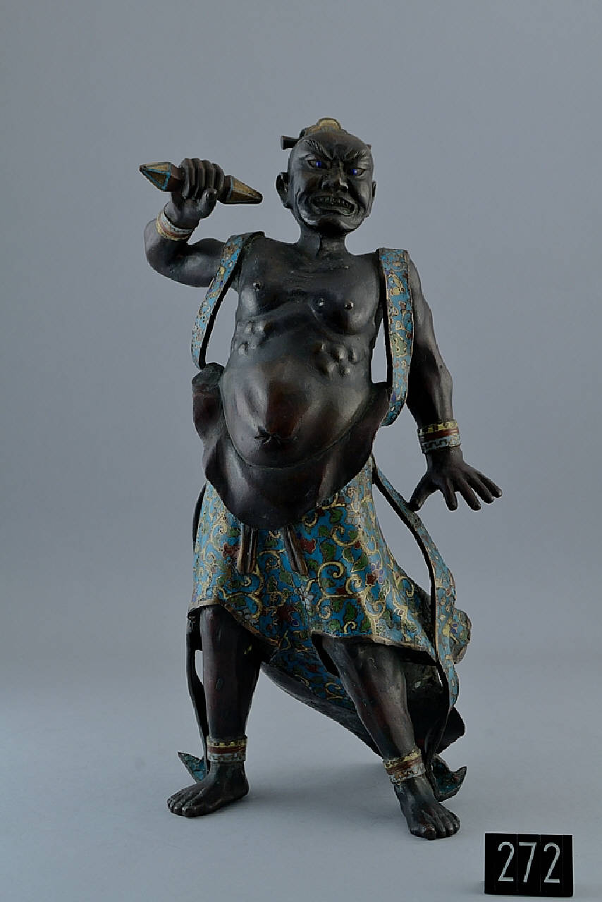 Statua in bronzo e smalti champlevé di Kongorikishi, tipicamente raffigurato come un uomo muscoloso, a ventre scoperto, lo sguardo irato, con uno scettro saetta nel pugno.