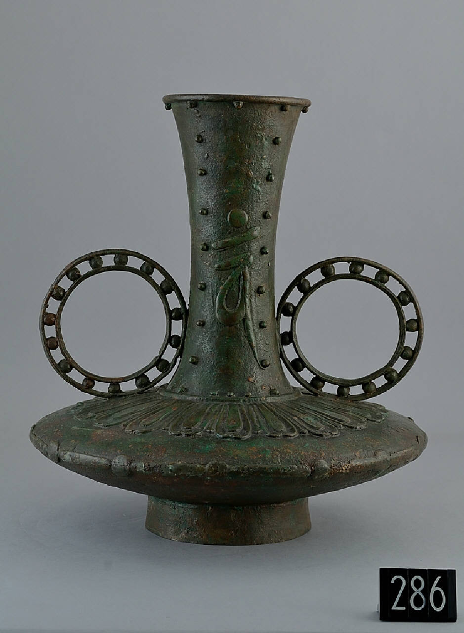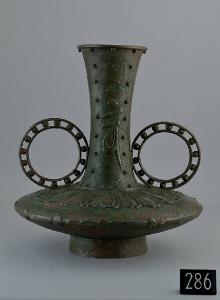 Vaso in bronzo con alto piede cilindrico, liscio, basso ventre lenticolare, schiacciato, adorno sull'orlo di borchie e fiori di loto a rilievo, lungo collo svasato a tromba nella zona terminale, con un segno sanscrito (bija) "om" al centro. Due doppi dischi concentrici intervallati da sfere, agganciati fra spalla e collo, fungono da anse. Sotto il piede è impresso un drago attorciliato a bassorilievo. la superficie del vaso è stata patinata di verde e rosso con dei pigmenti materici. All'interno si trova colofonia fusa e terra.