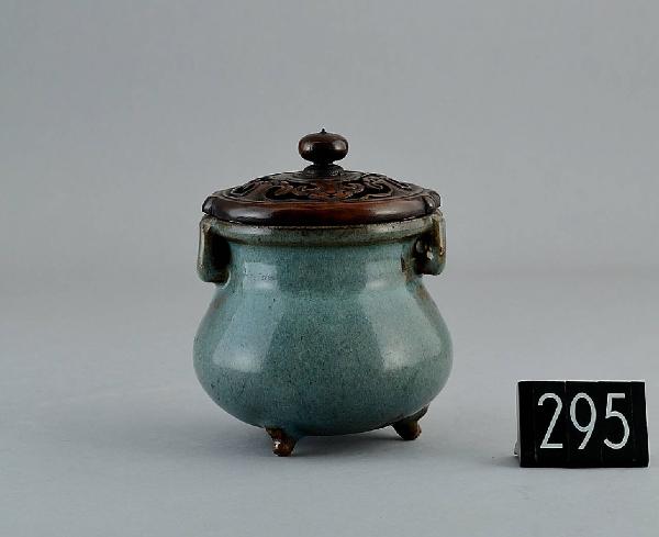Vasetto in ceramica con invetriatura monocroma azzurra con striature, tipo Jun, a tre piedini, pancia bombata, e breve collo circolare con piccole anse squadrate e forate che terminano sul bordo everso della bocca. Coperchio in legno intagliato e traforato, con pomolo centrale.