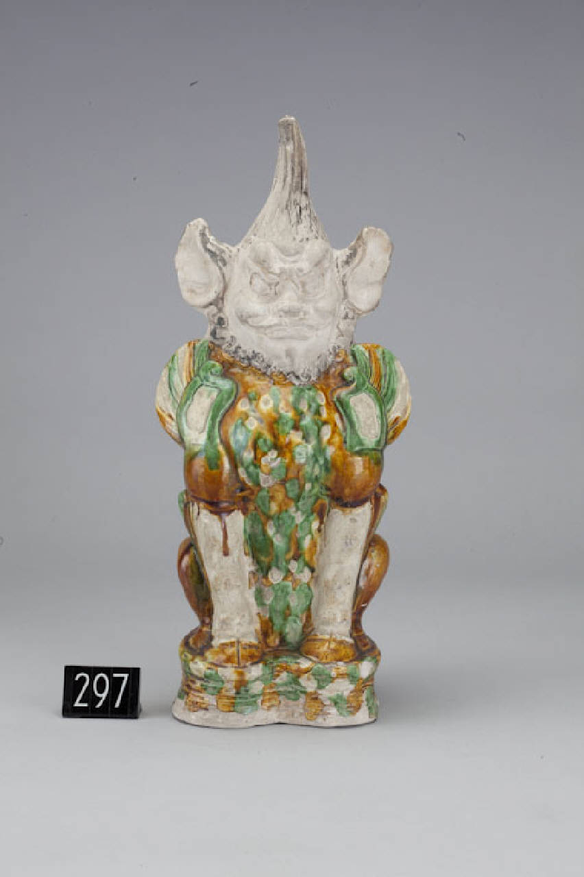 Statuetta mingqi raffigurante un guardiano di tomba (zhenmushou) in ceramica bianca con invetriatura a tre colori sancai. La chimera è rappresentata seduta, con il corpo taurino, zampe ungulate, piccole ali, volto umano barbuto, con orecchie d'elefante e cresta di gallo. Fa corpo con una base sagomata.