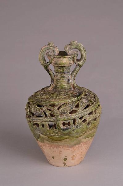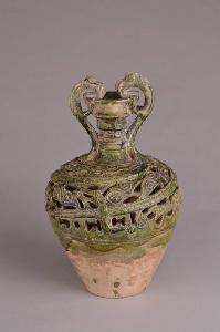 Vaso ad anfora con anse a forma di draghi, fra le nuvole, che si avvolgono a spirale partendo dal ventre e terminando sulla bocca. Superiormente traforato e con invetriatura verde opaca.