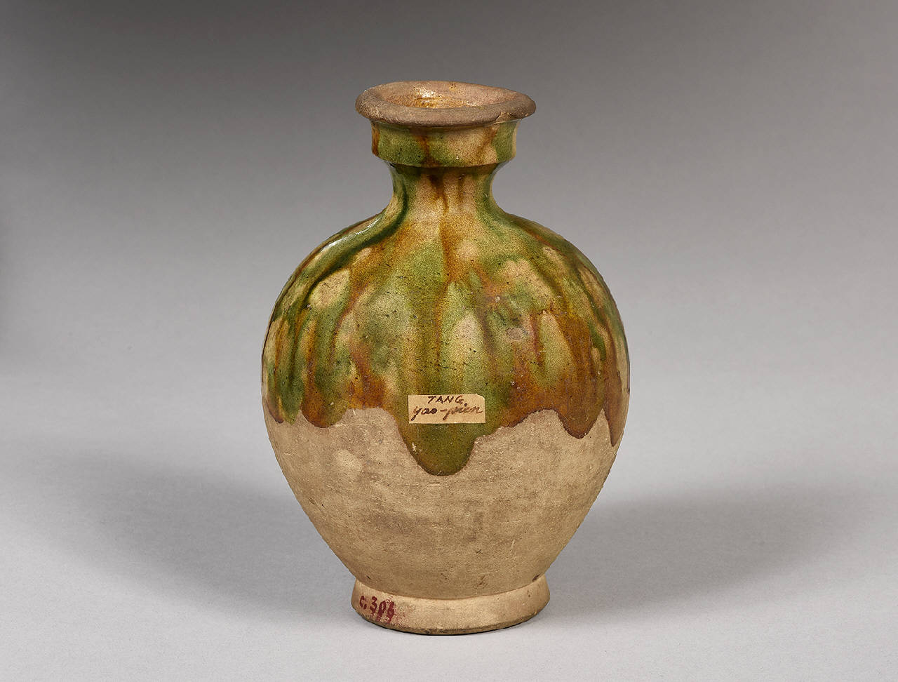 Vasetto a giara tipo hu. Terracotta con invetriatura a tre colori sancai, colante, che ricopre la parte superiore del vaso.