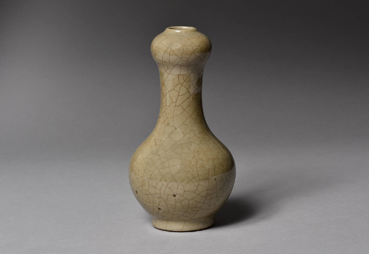Vasetto a "bocca d'aglio" santouping in grès porcellanoso con invetriatura di colore marrone-olivastro a grandi craqueleurs, in stile Ge .