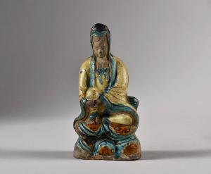Scultura in ceramica raffigurante Guanyin con il capo coperto su trono seduta in con braccia raccolte al ginocchio destro, parzialmente invetriata a colori blu scuro, azzuro, color ocra e giallo chiaro a rivelare il bisquit sottostante.