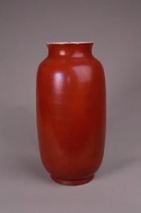 Vaso a "lanterna" in porcellana a invetriatura rossa, l'interno bianco.