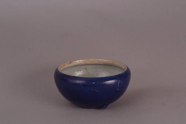 Ciotola ad invetriatura blu sottocoperta esterna e bianca internamente. Labbro rientrante e tre piedini sul fondo.