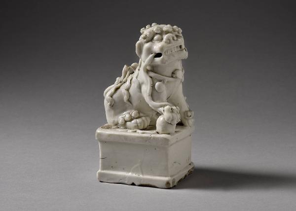 Leoncino cinese in porcellana bianca invetriata, su base a pianta rettangolare, con una palla di broccato sotto la zampa anteriore destra. La criniera è resa a riccioli e trecciole lungo tutto il dorso. In coppia con C365.