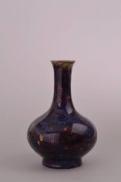 Vaso a bottiglia dal basso piede, leggermente conico e lugo collo e labbro espanso. In porcellana molto spessa e pesante, con invetriatura craquelé e seconda vetrina blu a striature bianche ottenuta su una seconda cottura.