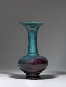 Vaso dal basso ventre espanso con basso piede circolare, lungo collo e bocca espansa a tromba. La coperta, spessa, è verde mare per tutta la parte superiore del vaso, fino all'inizion del collo, e violanella parte inferiore.