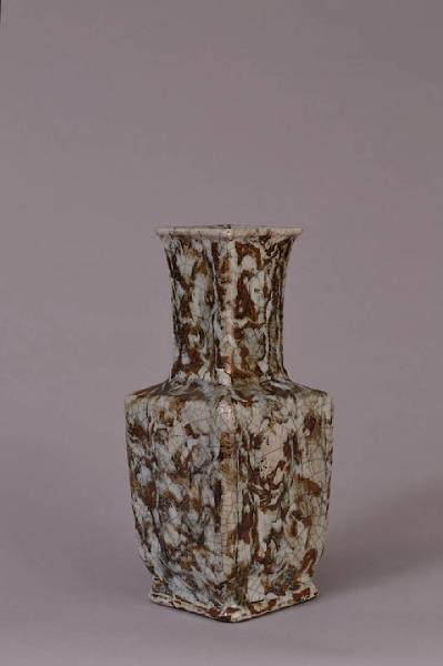 Vaso a sezione quadrangolare, collo più stretto e bocca leggermente espansa.\nE' cmpletamente percorso da grossi craqueleures e presenta macchie marrone verdastro sotto coperta e leggere tracce d'azzurro.