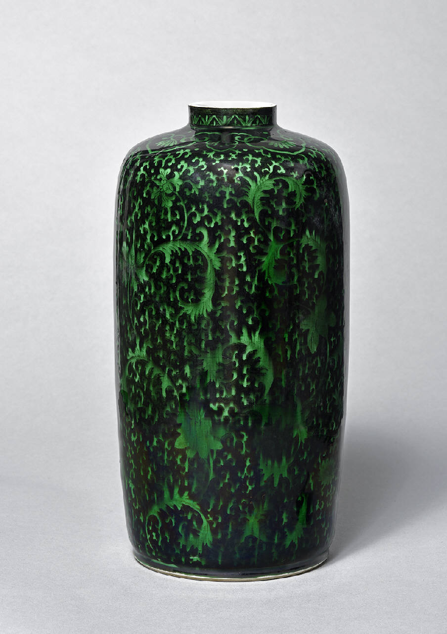 Vaso cilindrico a bocca stretta e collo basso, in porcellana a smalti verde su fondo nero. La vetrina presenta piccole lacune e il decoro di fiori di peonia e margherite (?) è sfumato e colante in alcune parti. Alla base in marchio in blu sottocoperta a sei caratteri del regno Yonghzheng.