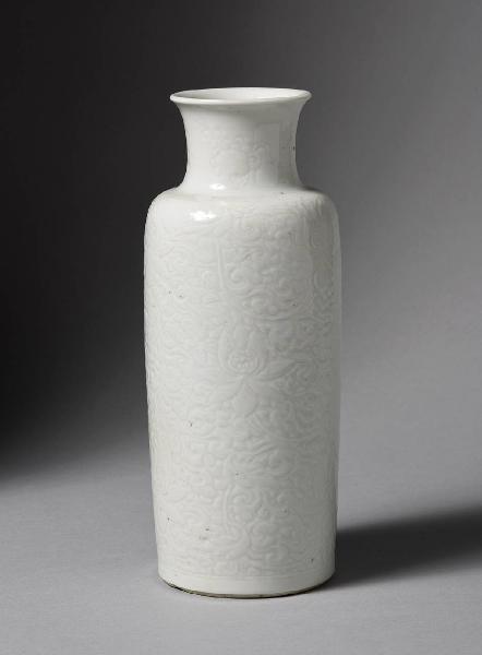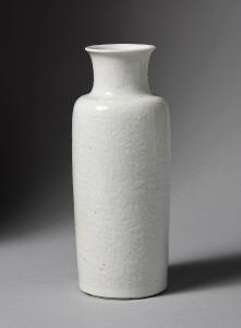 Vaso cilindrico, a bocca leggermente espansa, in porcellana bianca a decoro inciso di fiori di loto su tutto il corpo e susino sul collo. In coppia con 396