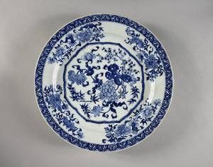 Grande piatto in porcellana biancoblu con decoro di peonia, susino, loto, crisantemo, pesco (?) e bambù entro cartella polilobata. All'esterno peonie e susini e sulla tesa una fascia di piccole pagode entro motivo di fungo sacro. Sul verso della tesa due racemi. I piatti C411 e C412 hanno lo stesso decoro, ma sono più piccoli.