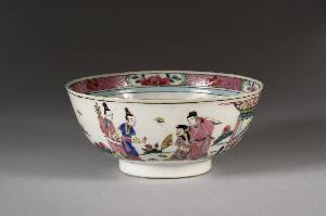 Famiglia rosa fencai. Tazza in porcellana a smalti sopracoperta con decoro raffigurante due dame che vengono accolte in giardino da due uomini con vestito da mandarino e ventaglio in mano. All'interno la tazza presenta un fiore centrale e sul bordo una fascia rosa interrotta da quattro cartelle con fiori.