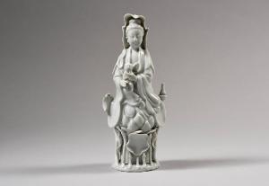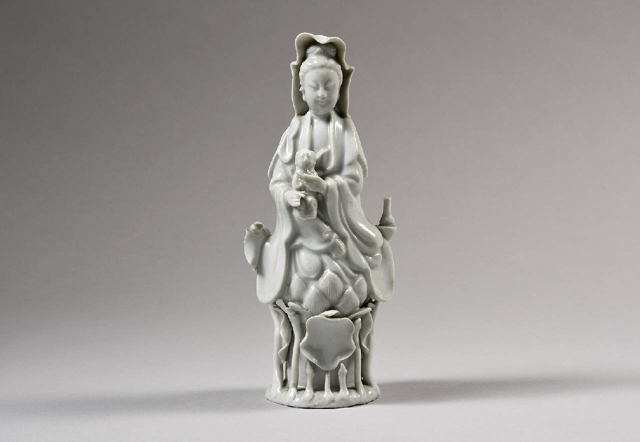 Guanyin su fior di loto, fra piante acquatiche. Il bodhisattva è raffigurato con un fanciulli fra le mani. Alla sua sinistra la fiaschetta amrita e alla sua destra una colomba (?).\nI capelli e il loto sono decorati con leggero intaglio sotto coperta.