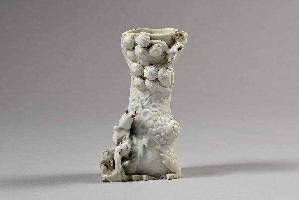 Vassetto a forma di tronco d'albero con funghi e un piccolo uccello su una radice (?).