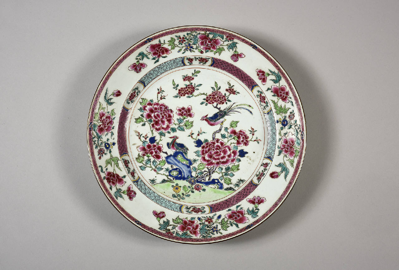Grande piatto in porcellana a smalti Famiglia Rosa con decoro centraledi coppia di fenici tra rocce ornametali e rami in fiore, con orlo e fascia interna a motivi geometrici.