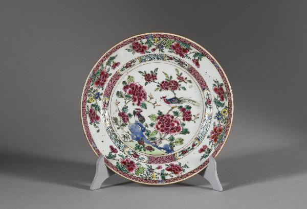 Piatto in porcellana a smalti Famiglia Rosa con decoro centraledi coppia di fenici tra rocce ornametali e rami in fiore, con orlo e fascia interna a motivi geometrici.