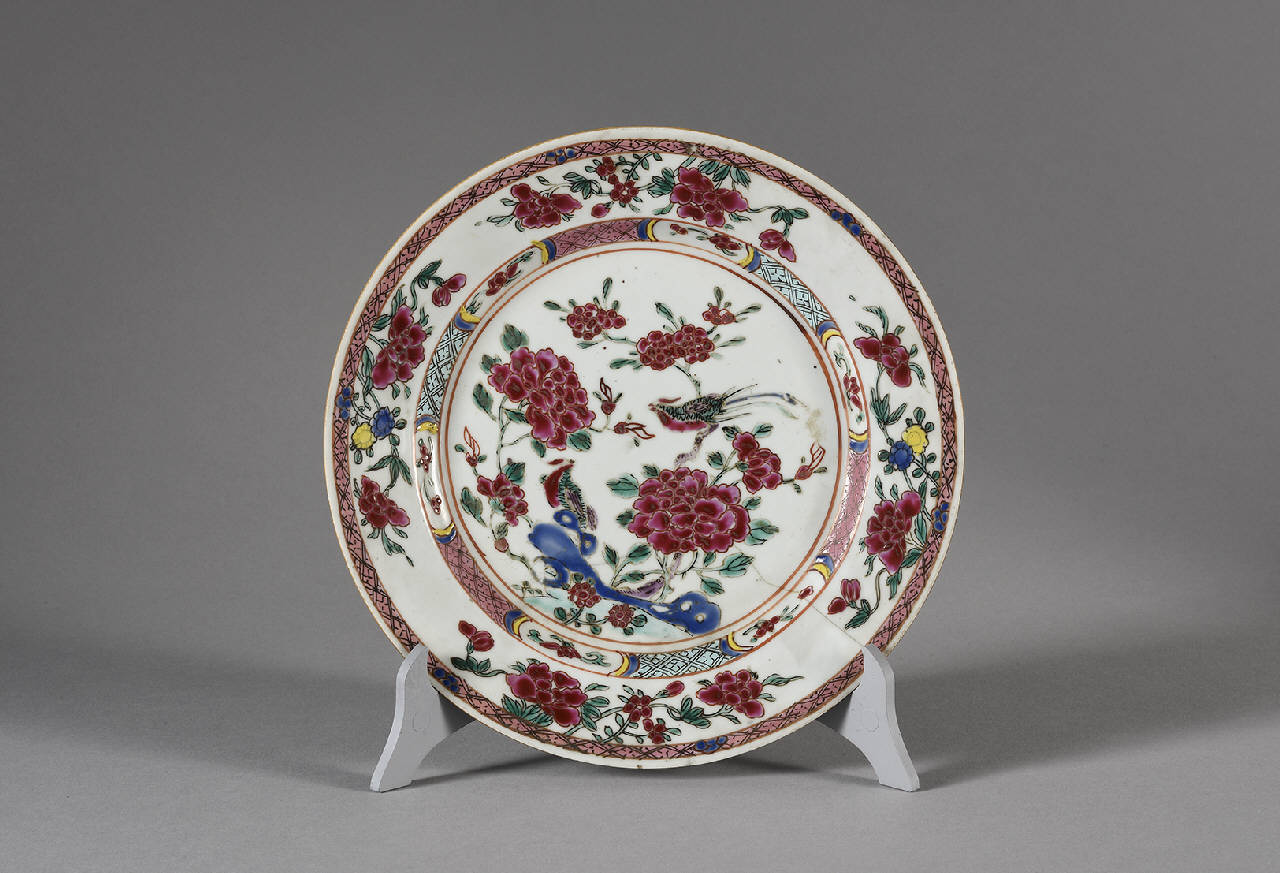 Piatto in porcellana a smalti Famiglia Rosa con decoro centraledi coppia di fenici tra rocce ornametali e rami in fiore, con orlo e fascia interna a motivi geometrici.
