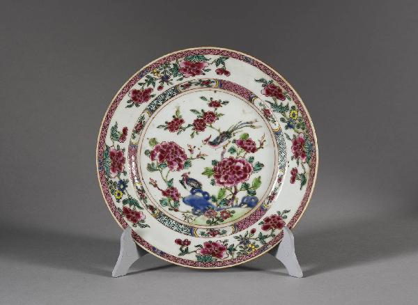 Piatto in porcellana a smalti Famiglia Rosa con decoro centraledi coppia di fenici tra rocce ornametali e rami in fiore, con orlo e fascia interna a motivi geometrici.