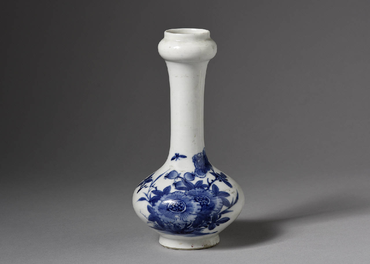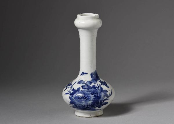 Vaso dall'imboccatura a "testa d'aglio" in porcellana bianca e blu decorato con motivi floreali e insettiDecoro in blu sottocoperta di fiori e insetti.