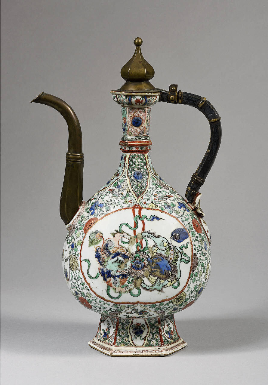 Versatoio con montatura metallica. Porcellana dalla forma a pera, con piede esagonale espanso alla base. La decorazione in Famiglia Verde a smalti verde, giallo, blu e rosso sopracoperta raffigura due leoni buddhisti al centro di una cartella ovale, e motivi floreali e geometrici nel resto del corpo. Il beccuccio, il manico e il coperchio sono in bronzo.