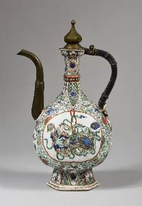 - NOTIZIE STORICO CRITICHE Un ottimo esemplare di porcellana d'esportazione per il Medio Oriente, di forma particolare, interessante per l'utilizzo del bronzo Forma di derivazione dalla metallurgia Turca (aftaba) o indiana, caratterizata da un corpo piriforme e beccuccio sinuoso. Produzione tipica della manifattura di Jingdezhen durante il sec. XVII, per l'esportazione verso l'India e il Medio Oriente, dove erano utilizzati per lavarsi le mani, infatti sono spesso accompagnati da bacili. Le corti di queste aree erano particolarmente ricche in questo periodo e continuano la tradizione di collezionare porcellane cinesi, iniziata duranta la dinastia Yuan. Un esempo simile ma con decoro bianco e blu è illustrato nella collezione del Topkapi Palace Museum (Mazzeo 2018)