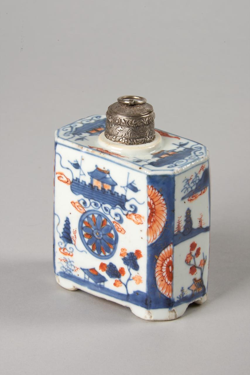 Fiasca rettangolare con angoli smussati e chiusura in metallo. Decorazione di tipo imari con crisantemo al centro dei lati maggiori, su sfondo di paesaggio terreno e celeste.