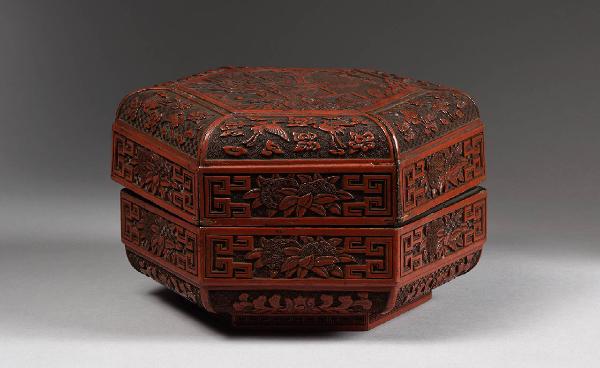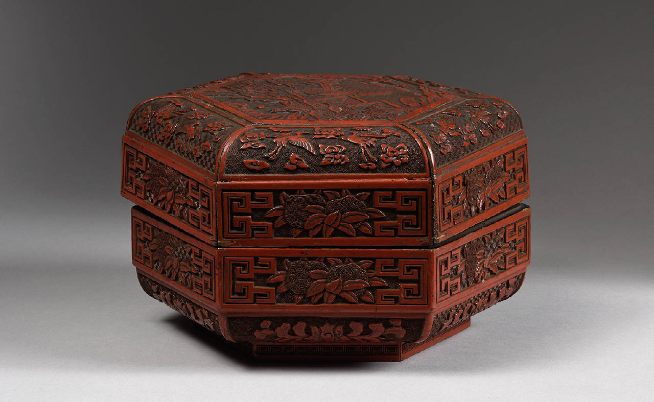 Scatola esagonale con piede basso e coperchio combaciante a incastro, in lacca rossa su legno. Il decoro a intagliato rappresenta letterati a servitori che osservano un rotolo di pergamena in un giardino. La scena bordata da pannelli decorati con aironi in volo tra nuvole. I lati esterni e la base con motivi floreali e geometrici. L'interno laccato in nero.
