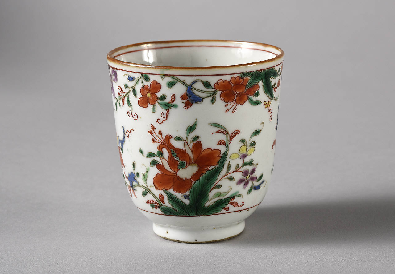 Coppetta in porcellana policroma a smalti sopracoperta nei toni del rosso, verde, giallo, blu e viola decorato con motivi floreali. Medesimo decoro piattini C884 e C 441