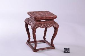 Tavolino da cerimonia a quattro gambe terminanti su un piccolo ripiano quadrangolare, in lacca rossa intagliata a fiori e con il carattere shou "longevità" ricavato sul piano.