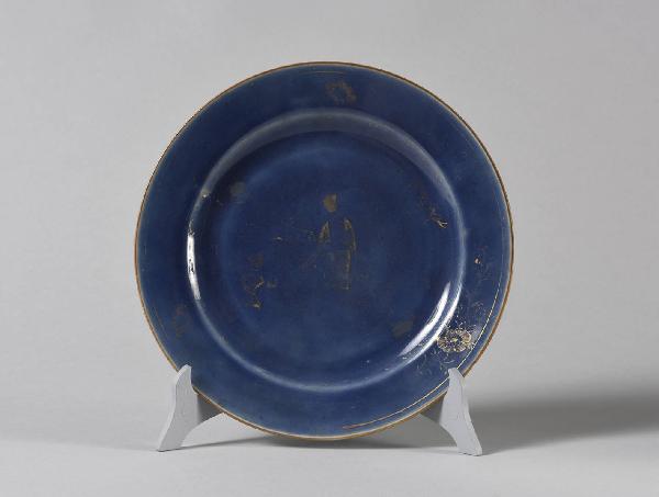 Piatto a invetriatura blu polvere decorato con dorature floreali, sull'orlo altri fiori e foglie intervallati. Al centro scena di giardino con un uomo in tunica, fanciullo con vaso di fiori e un bufalo, con panorama di alberi.