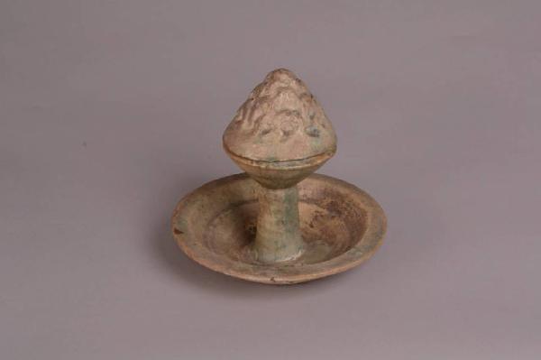 Boshanlu, incensiere con coperchio a forma di montagna. La forma è quella classica del fusto cilindrico terminante in un cono rovesciato, al centro di un piatto fondo.