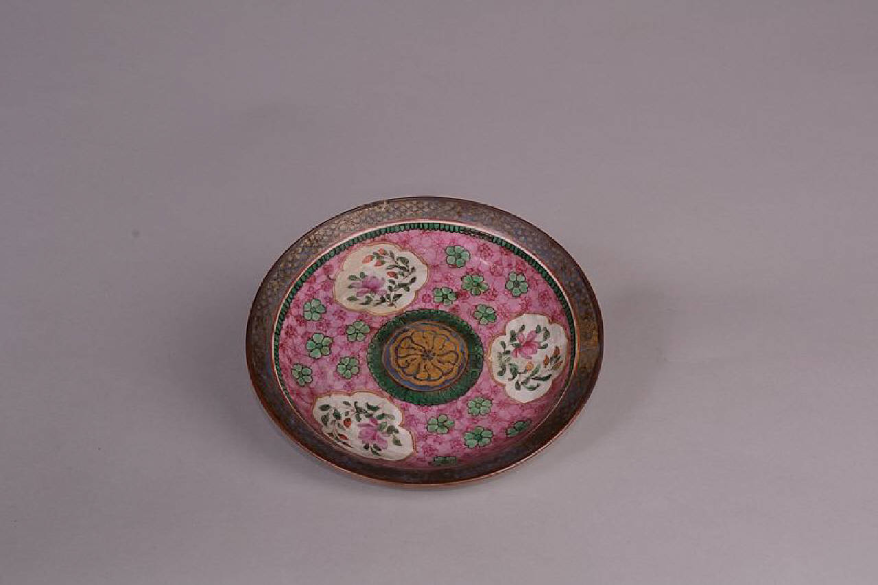 Piatto fondo in porcellana a smalti Famiglia Rosa, riccamente decorato con fiore centrale contornato da tre cartelle sagomate contenenti rami in fiore, su fondo rosa e rubino a motivo di "crackled ice" abbellito da ulteriori motivi floreali verdi. Il bordo con motivi geometrici in blu e oro. Alla base marchio apocrifo Jiaqing.