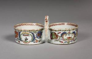 Salsiera a due coppette cilindriche con ansa centrale a fiocco. Decorazione a smalti della famiglia rosa nello stile "Pompadour"con pesce (rappresentante Madame de Pompadour) entro riserva floreale e uccello (rappresentante il Re Luigi XV) entro cartella floreale sormontata da una corona . Sul fondo delle due coppette una peonia.