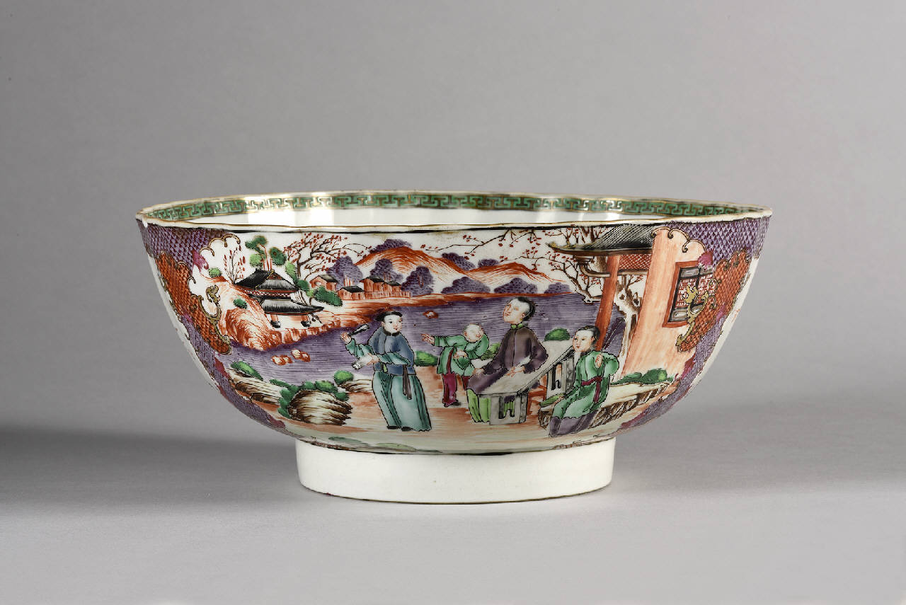 Coppa da punch con piede circolare dal bordo lobato e decoro Famiglia Rosa, scene con personaggi presso padiglioni su terrazze, alternati a scene con coppie di uccelli tra rami in fiore, entro cartelle lobate su fondo di rombi viola e rosso rubino con bordature dorate. All'interno bordo geometrico a fondo verde con decoro floreale al centro.