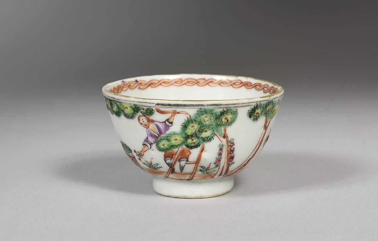 Coppetta con decoro a smalti sopracoperta della famiglia rosa raffigurante degli occidentali fra i quali una donna che raccolglie frutti da un albero. All'interno, vicino all'orlo una fascia a corda intrecciata in rosso e oro.