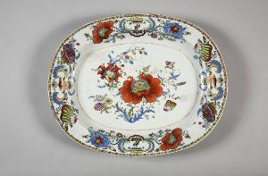 Grande piatto da portata o vassoio ovale in porcellana decorato con smalti sopracoperta nella cromia della famiglia rosa. Nella decorazione figurano una grossa peonia centrale e attorno frutti di loto, fiori di limone (?), campanule e altri fiori più piccoli. Al centro delle estremità più brevi due carpe araldiche entro cartiglio fitomorfo e alle estremità più lunghe due uccelli entro cartiglio coronato. Decorazione detta "alla pompadour".