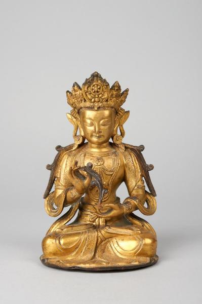 - NOTIZIE STORICO CRITICHE Bronzo molto giallo. La doratura, brillante e uniforme, sembrerebbe eseguita a fuoco. L'importanza dell'opera è da ricercarsi nell'eleganza delle proporzioni, nella precisione della ricca decorazione e, non ultimo, la presenza del rotolo di preghiera rimasto intonso nei secoli. Il rigonfiamento del busto e la forma ampia ma appuntita del viso farebbero pensare più ad una produzione nepalese che cinese.
