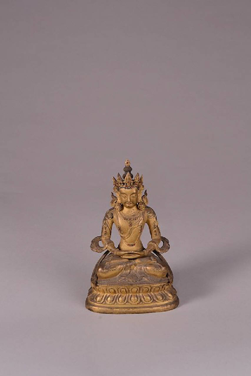 Scultura in bronzo dorato raffigurante bodhisattva che presenta una preziosa corona a cinque punte e una vistosa usnisa azzurra, è seduto nella posizione del loto padmasana su un piedistallo trangolare formato da una doppia fila di petali di loto. Le mani sono tenute nel gesto della meditazione dhyanamudra e presentano un foro. Grossi orecchini pendenti e collane di gioielli scendono sul petto.